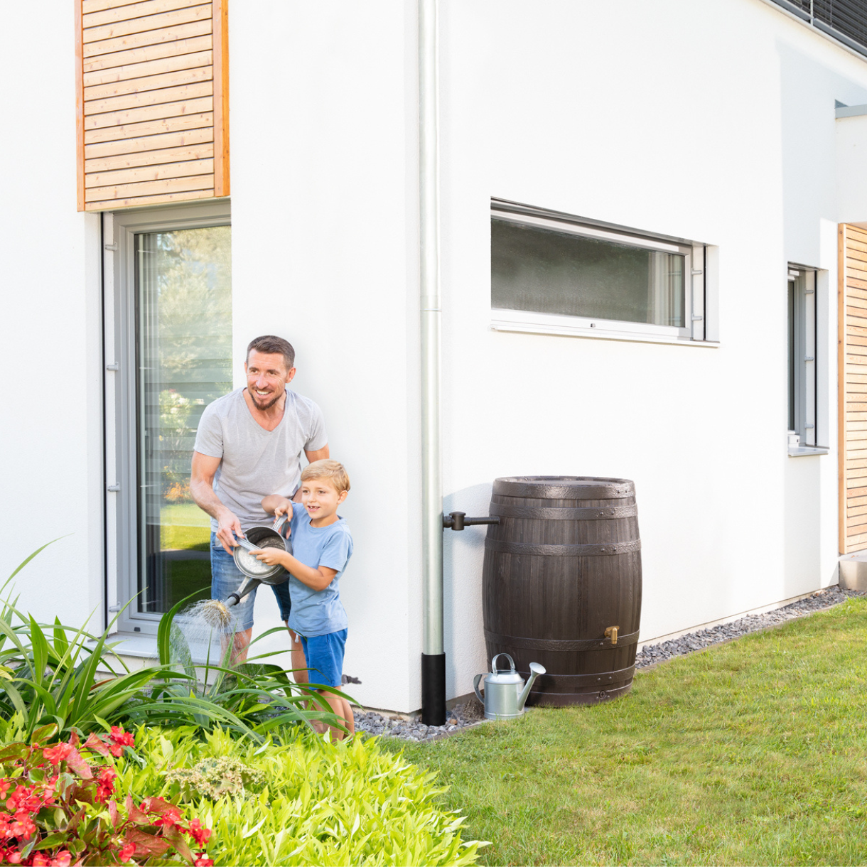- Beczka na deszczówkę Vino jest wytwarzana w 100% z materiałów pochodzących z recyklingu. Dzięki specjalnemu procesowi produkcji każda beczka na wodę jest unikalna i odznacza się wyglądem łudząco imitującym drewno. Pokrywę można zdejmować w celu czerpania wody i zawiera ona wbudowane zabezpieczenie przed przypadkowym otwarciem. Oprócz tego beczka na wodę jest szczególnie odporna na promieniowanie UV oraz warunki atmosferyczne. Zalety beczki: