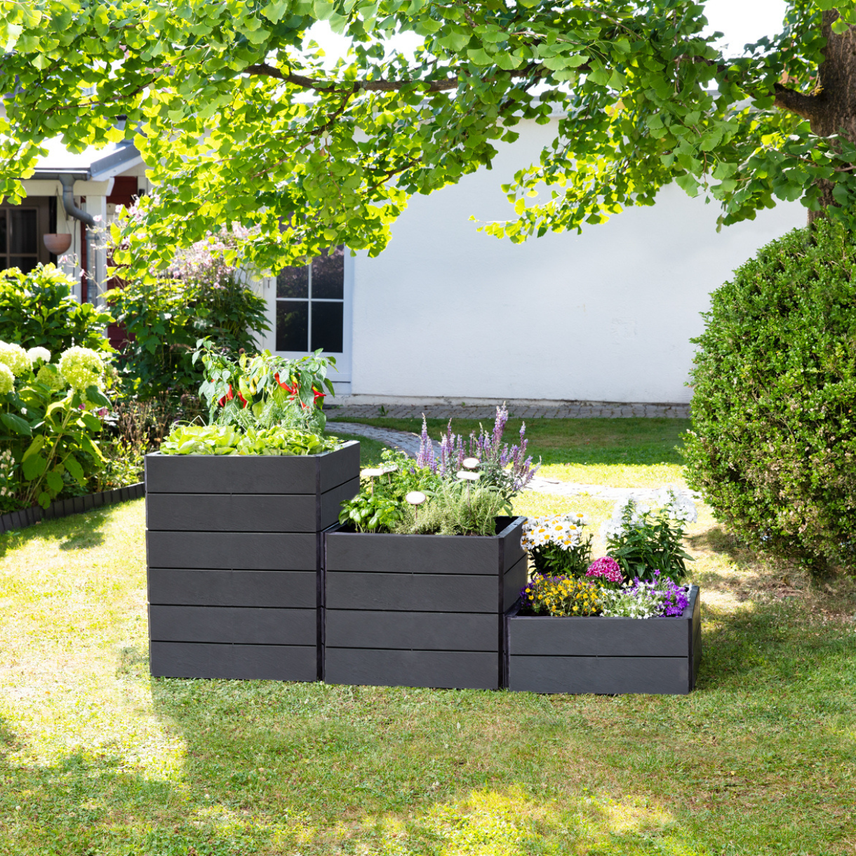 Bogate w składniki odżywcze wypełnienie grządek podwyższonych, np. kompostem i ziemią ogrodową, tworzy idealną pożywkę dla rosnących roślin. Wyższa temperatura gleby w grządce pozwala roślinom szybciej się rozwijać. Dzieje się tak zarówno dzięki bocznemu promieniowaniu słonecznemu, jak i rozkładowi poszczególnych warstw gleby. W grządkach podniesionych Ergo Quadro świetnie rozwijają się warzywa, owoce i zioła. Praktyczny kwadratowy kształt grządek Ergo Quadro daje wiele możliwości aranżacyjnych - wysokość i szerokość grządek można dopasować do swoich potrzeb.