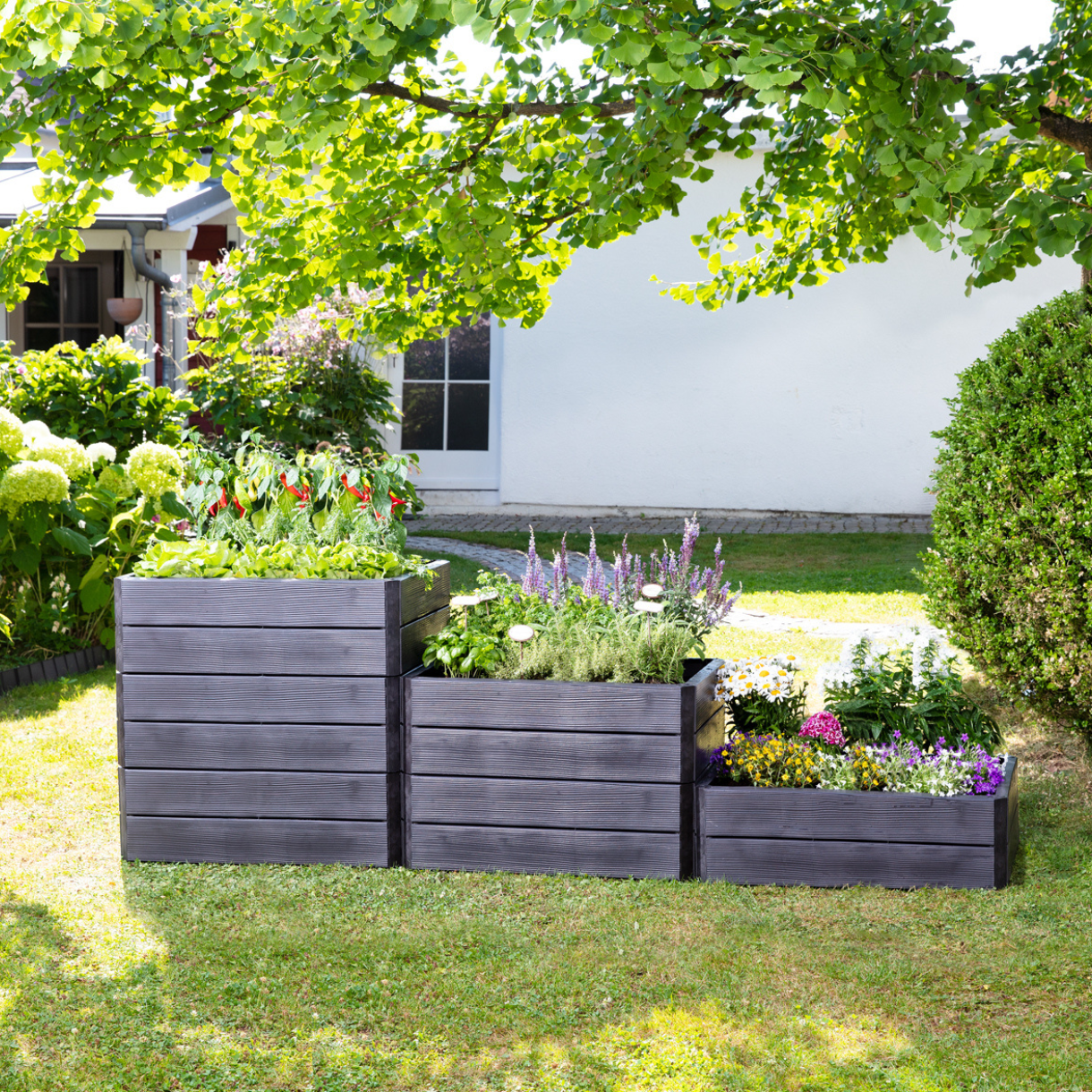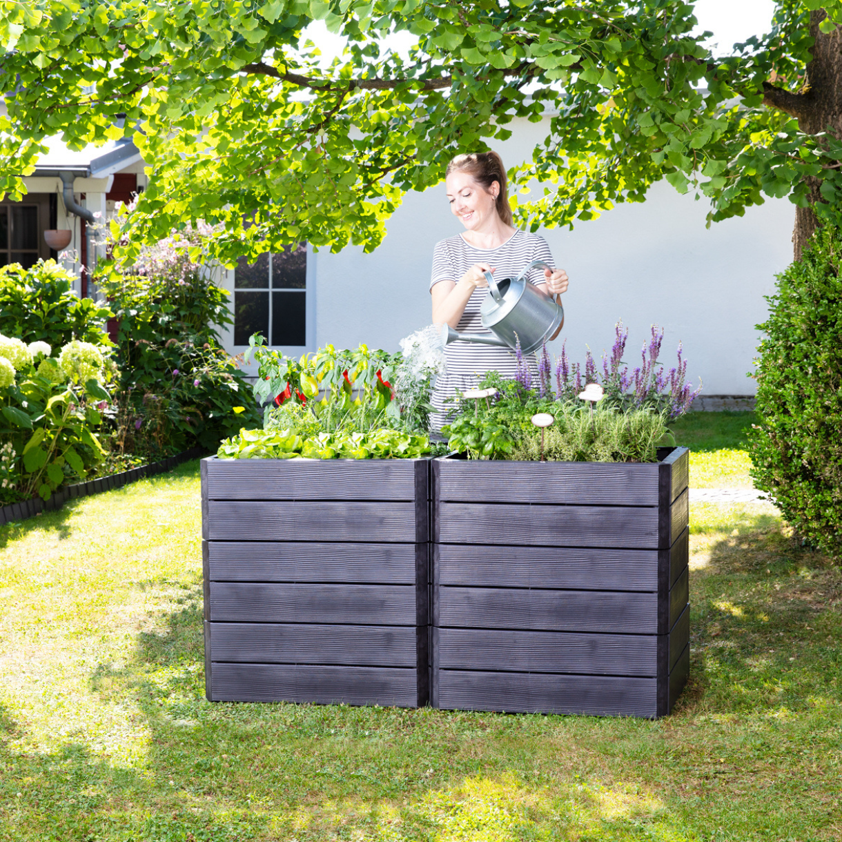 Bogate w składniki odżywcze wypełnienie grządek podwyższonych, np. kompostem i ziemią ogrodową, tworzy idealną pożywkę dla rosnących roślin. Wyższa temperatura gleby w grządce pozwala roślinom szybciej się rozwijać. Dzieje się tak zarówno dzięki bocznemu promieniowaniu słonecznemu, jak i rozkładowi poszczególnych warstw gleby. W grządkach podniesionych Ergo Quadro świetnie rozwijają się warzywa, owoce i zioła. Praktyczny kwadratowy kształt grządek Ergo Quadro daje wiele możliwości aranżacyjnych - wysokość i szerokość grządek można dopasować do swoich potrzeb.