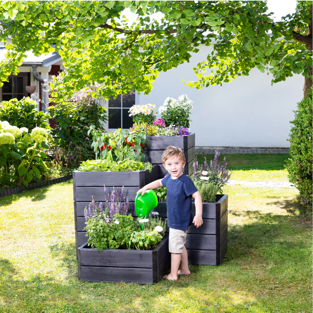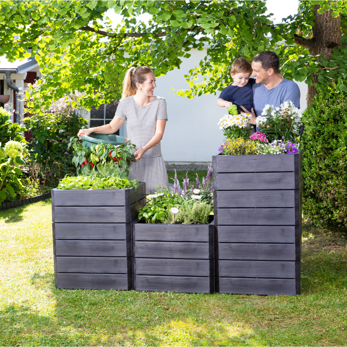 Bogate w składniki odżywcze wypełnienie grządek podwyższonych, np. kompostem i ziemią ogrodową, tworzy idealną pożywkę dla rosnących roślin. Wyższa temperatura gleby w grządce pozwala roślinom szybciej się rozwijać. Dzieje się tak zarówno dzięki bocznemu promieniowaniu słonecznemu, jak i rozkładowi poszczególnych warstw gleby. W grządkach podniesionych Ergo Quadro świetnie rozwijają się warzywa, owoce i zioła. Praktyczny kwadratowy kształt grządek Ergo Quadro daje wiele możliwości aranżacyjnych - wysokość i szerokość grządek można dopasować do swoich potrzeb.