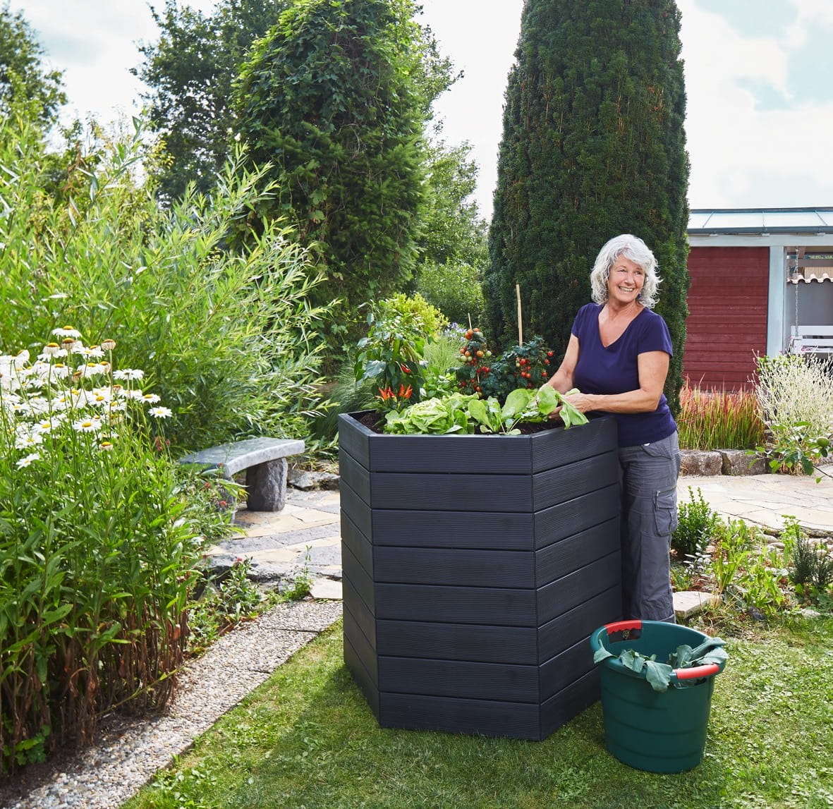 Wysokość grządek Ergo można dostosować do indywidualnych potrzeb, zapewniając sobie ergonomiczną pracę w ogrodzie. Składa się je stosunkowo łatwo i szybko bez potrzeby używania narzędzi. Wykonane z wysokiej jakości tworzywa sztucznego podwyższone rabaty, przekonują swoim realistycznym wyglądem drewna oraz nieskończoną ilością możliwości łączenia. Stwórz własną kompozycję w swoim ogrodzie!