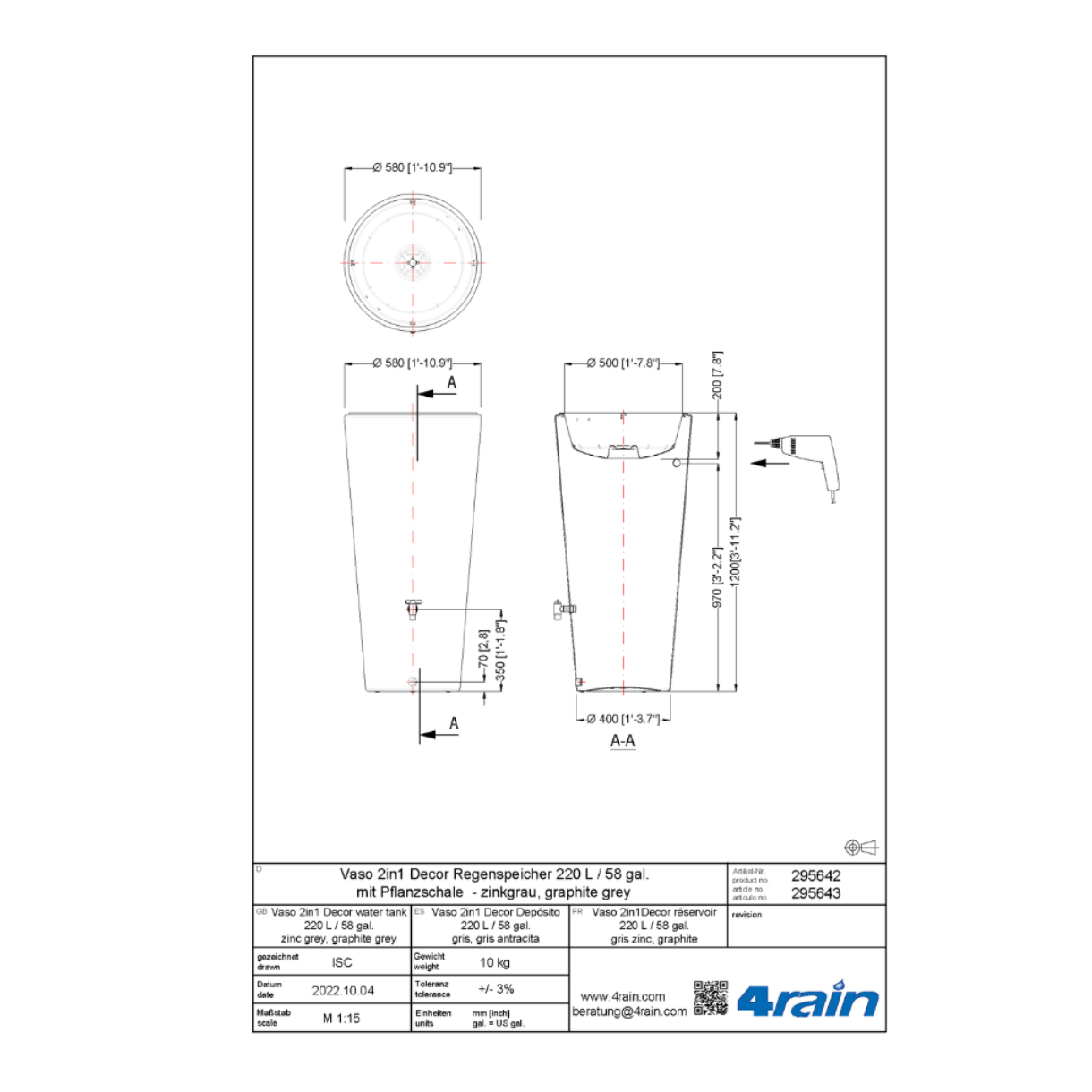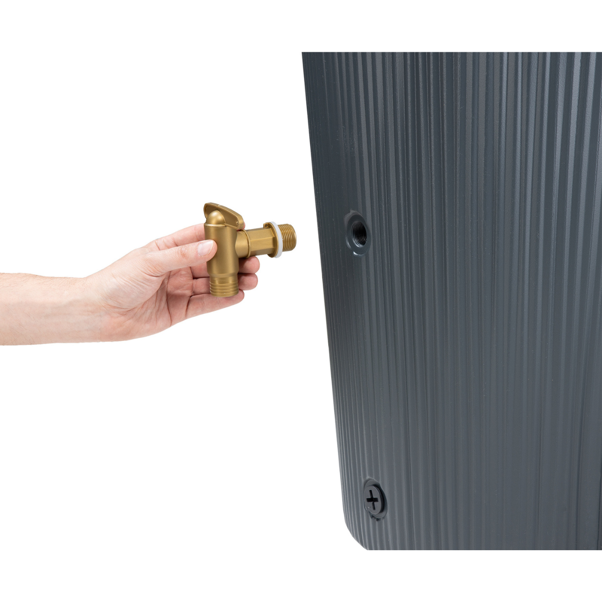 - Zawartość opakowania: Zbiornik na deszczówkę Vaso 2w1 decor grafitowy, plastikowy kran Aqua-Quick, osłona przeciwwiatrowa, doniczka na rośliny z geowłókniną w komplecie