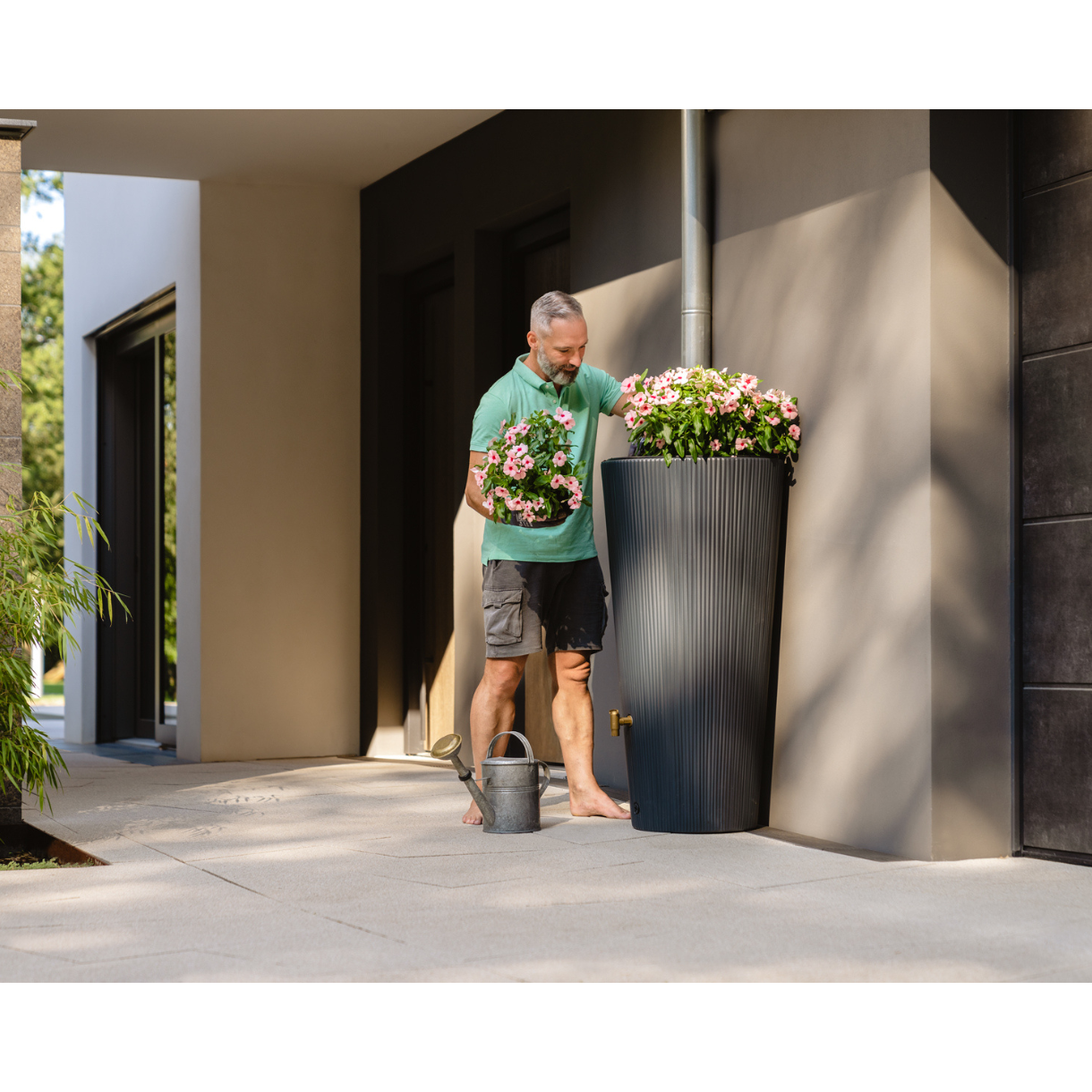 Szeroką gamę zbiorników na deszczówkę naziemnych uzupełnia dodatkowo bogaty wybór akcesoriów. Natomiast niektóre zbiorniki posiadają również dopasowaną donicę przystosowaną do sadzenia roślin, co umożliwia stworzenie pięknej kompozycji kwiatowej w ogrodzie.