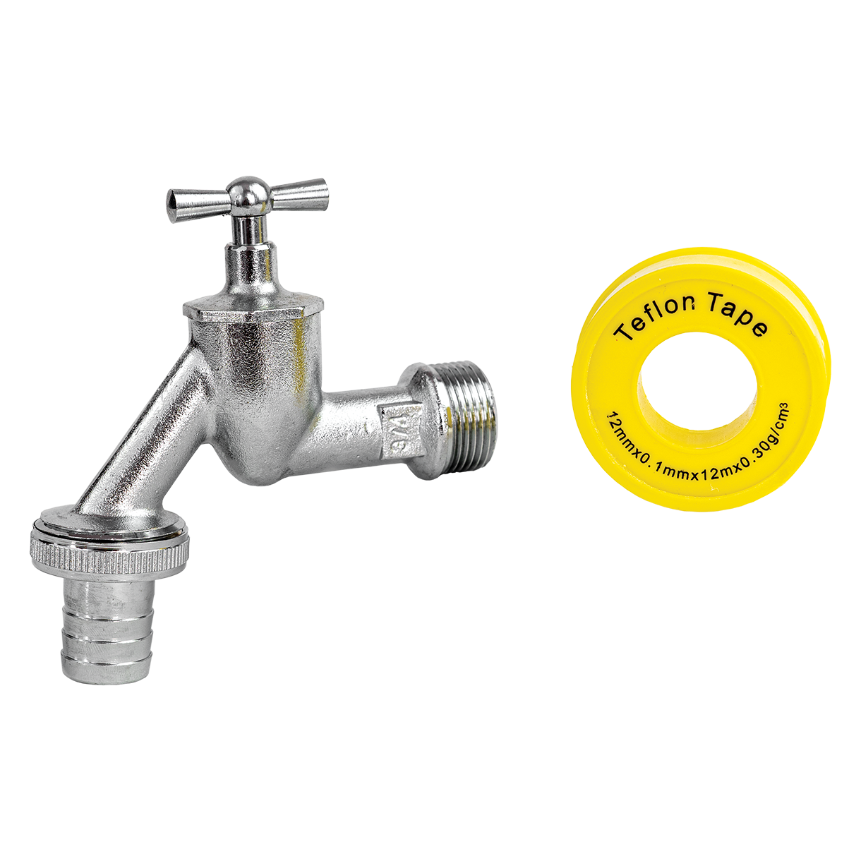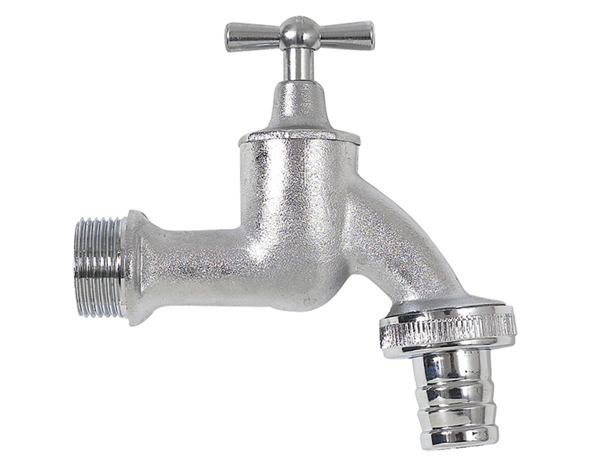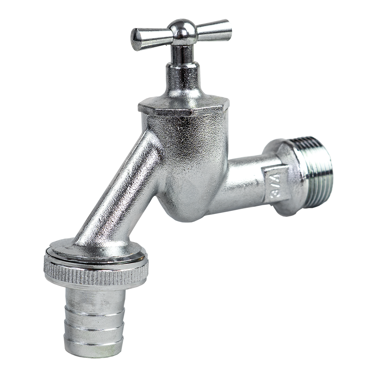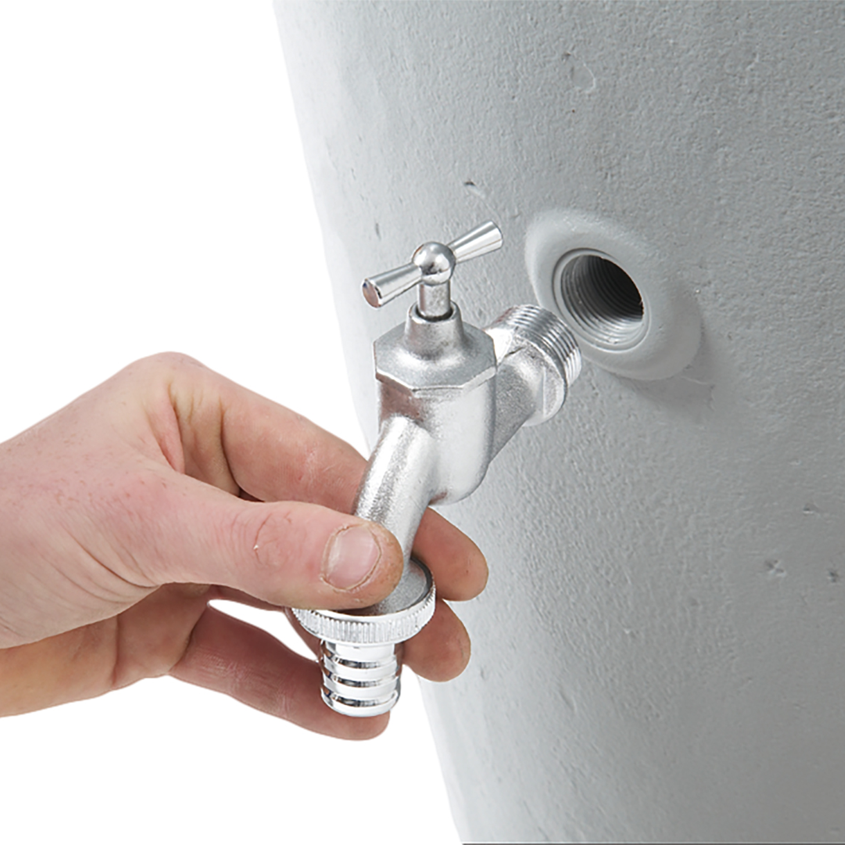Kran w kolorze srebrnym idealnie pasuje do zbiorników dekoracyjnych na deszczówkę.