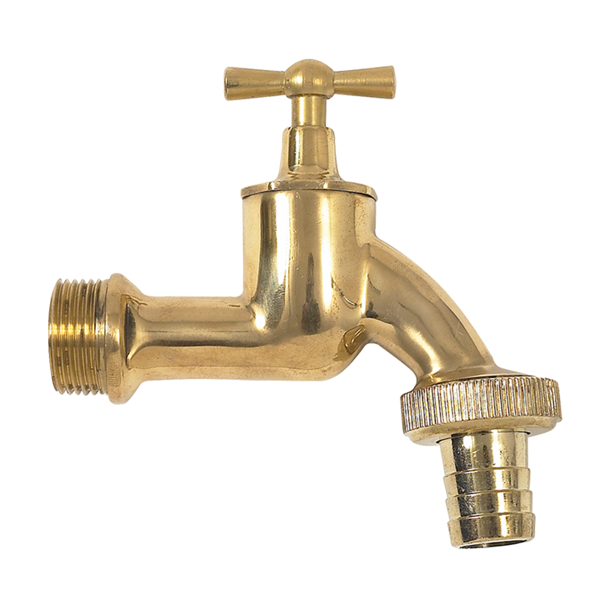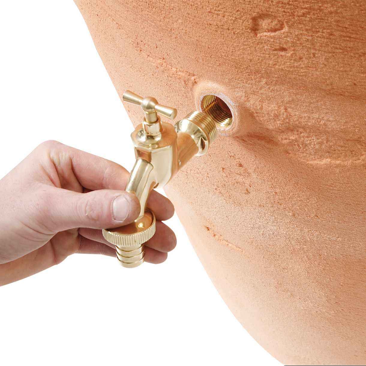 Kran w kolorze złotym idealnie pasuje do zbiorników dekoracyjnych na deszczówkę.