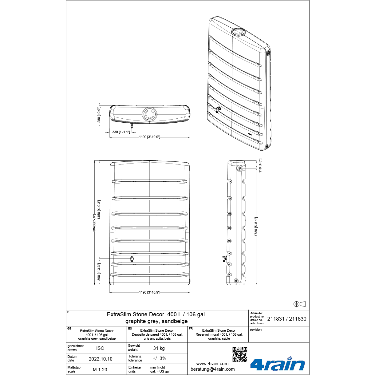 - Zakres dostawy: Zbiornik na deszczówkę Extra Slim Stone Decor 400 l przyścienny piaskowy, zabezpieczenie przed wiatrem, kran Aqua-Quick z tworzywa sztucznego w kolorze mosiądzu