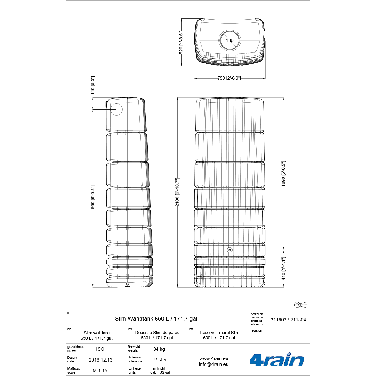 - Zakres dostawy: Zbiornik Slim 650 l przyścienny w kolorze ciemnozielonym, zabezpieczenie przed wiatrem, kran Aqua-Quick z tworzywa sztucznego