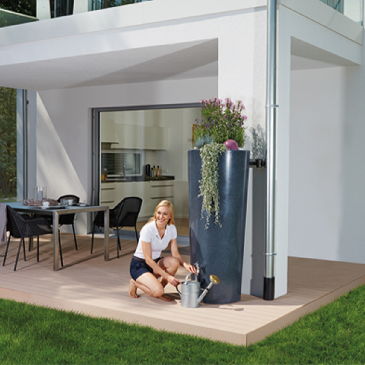 Szeroką gamę zbiorników na deszczówkę naziemnych uzupełnia dodatkowo bogaty wybór akcesoriów. Natomiast niektóre zbiorniki posiadają również dopasowaną donicę przystosowaną do sadzenia roślin, co umożliwia stworzenie pięknej kompozycji kwiatowej w ogrodzie.
