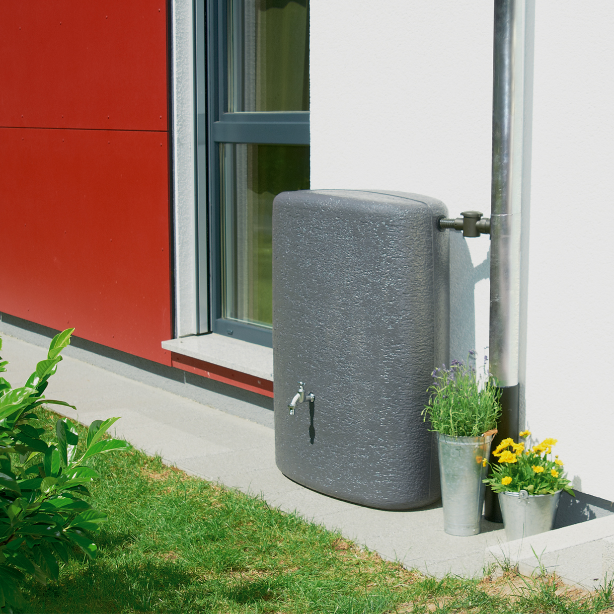 Zbiornik na deszczówkę Terranova to prosty, kompaktowy zbiornik na deszczówkę o fakturze tynku
