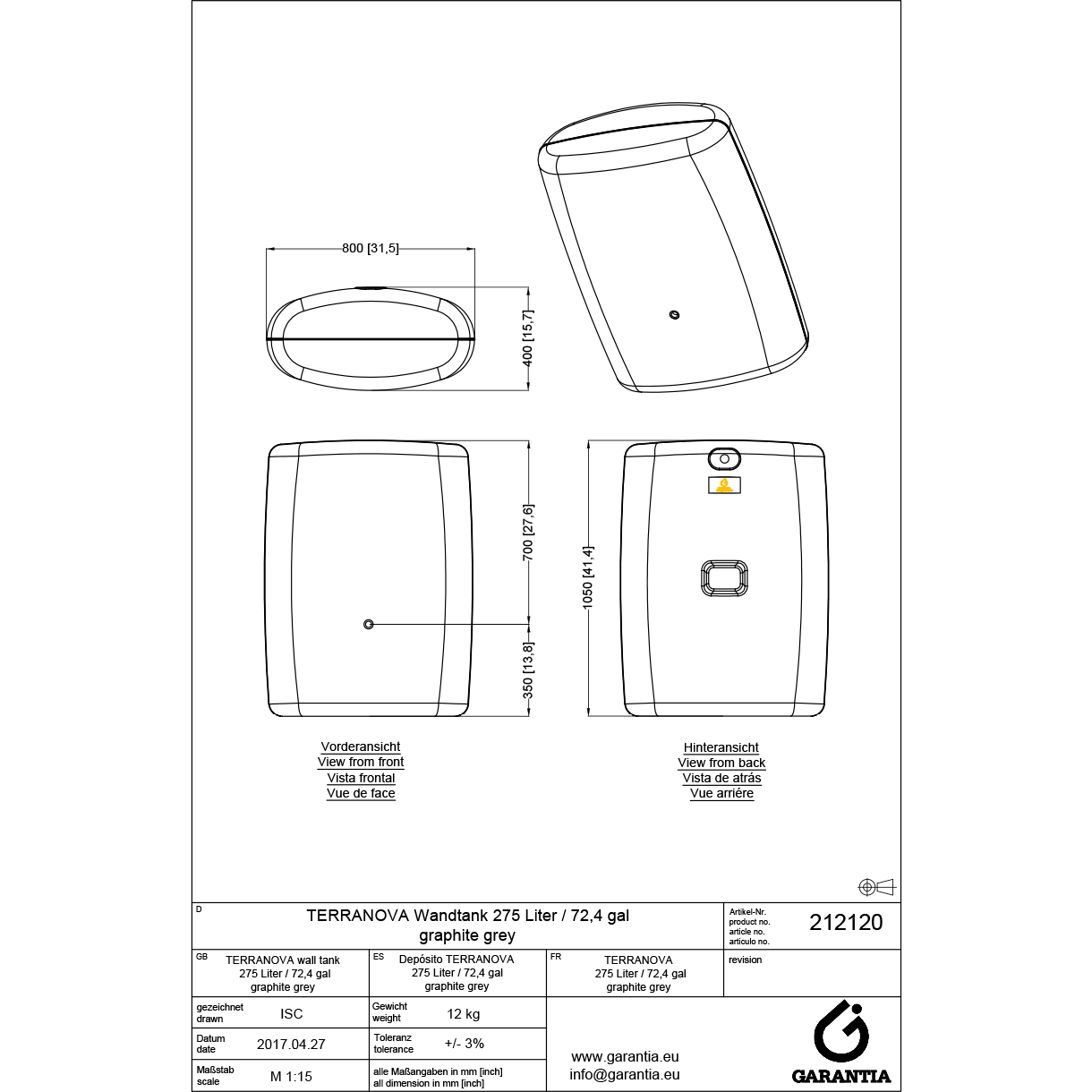 Zbiornik na deszczówkę Terranova 275 l przyścienny