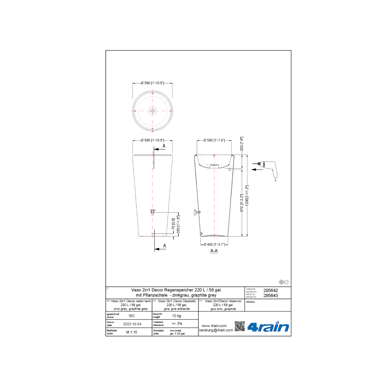 - Zawartość opakowania: Zbiornik na deszczówkę Vaso 2w1 decor, cynkowoszary, plastikowy kran Aqua-Quick, osłona przeciwwiatrowa, doniczka na rośliny z geowłókniną w komplecie